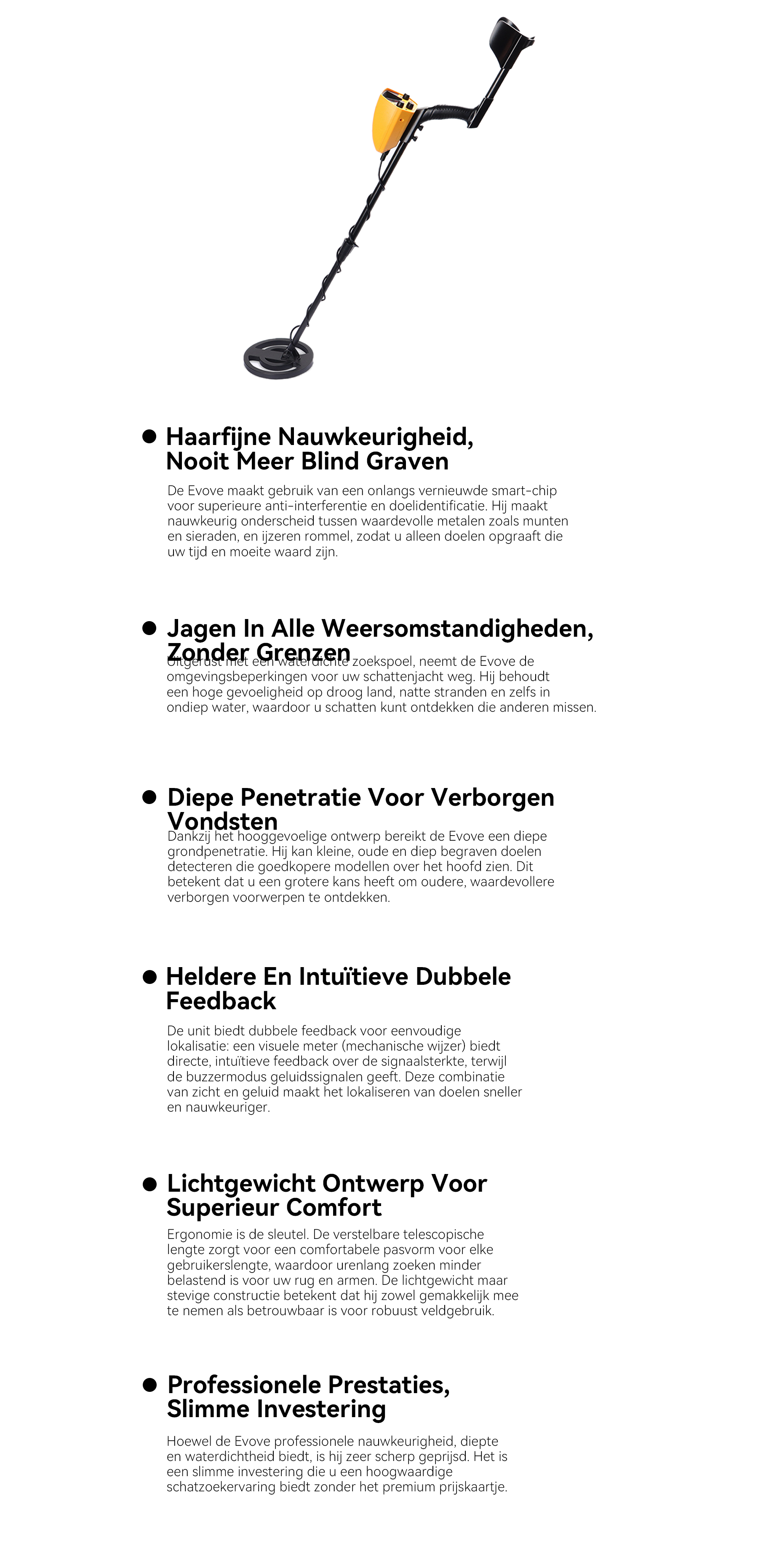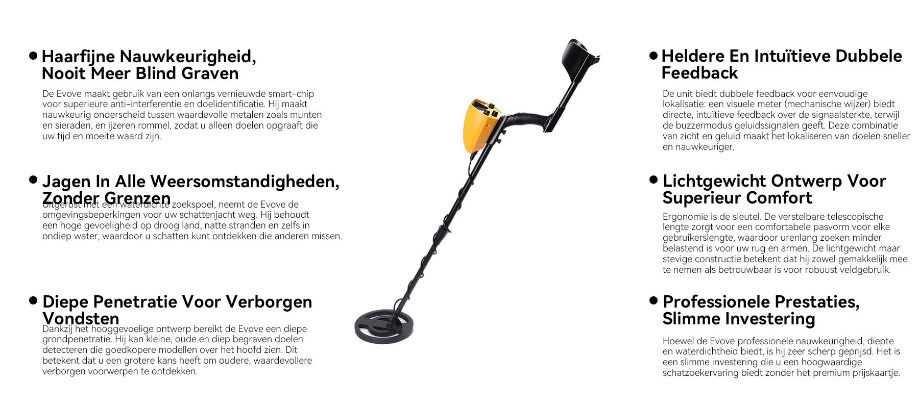 Dat geloof leidde tot de oprichting van Evove. Het merk belooft betrouwbare technologie te gebruiken, zoals slimme chips en een volledig waterdicht ontwerp, om het metaaldetecteren nauwkeurig, diep en onbeperkt te maken. De missie is om de echte vreugde van ontdekking naar alle enthousiastelingen te brengen.